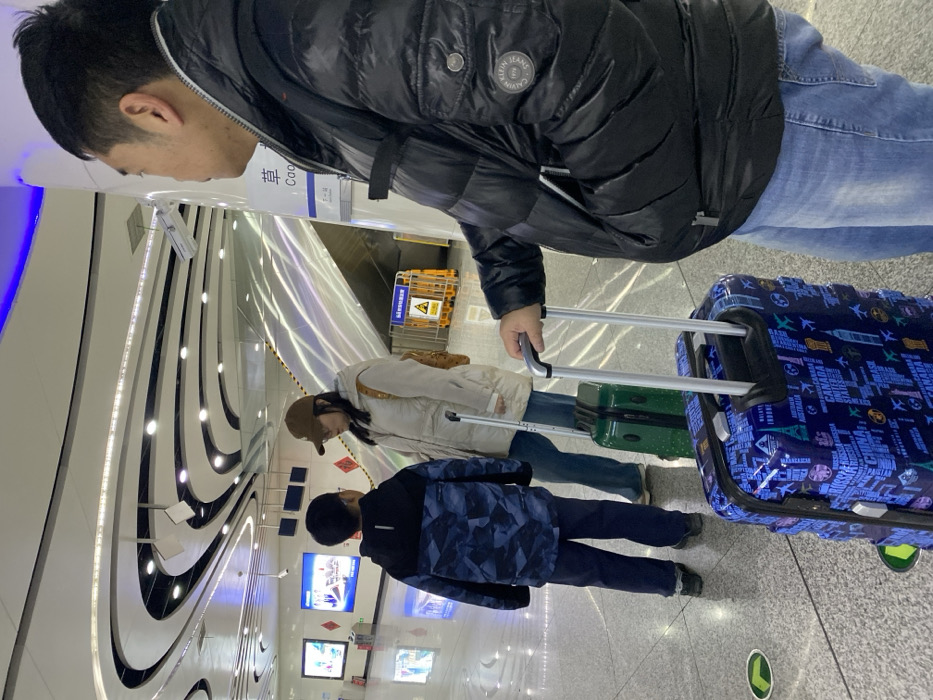 A family of three is at an airport, each pulling luggage. A man in a black puffer jacket and jeans is pulling a patterned blue suitcase. A woman in a tan jacket and jeans pulls a green suitcase. A child in a blue jacket and pants walks ahead of the suitcases. The airport has bright, modern lights and curving white walls. Yellow safety barriers are visible in the background. Directional arrows are on the floor.