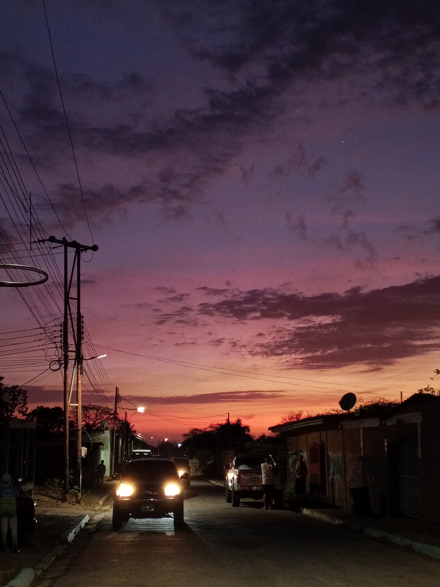 The image depicts a street scene at dusk in Santa Ana, Venezuela. The sky is a gradient of purples and oranges, suggesting a sunset or sunrise. Power lines crisscross the upper portion of the frame, attached to a utility pole on the left. A street light is illuminated in the mid-ground. Two vehicles are visible on the street: one SUV with headlights on is approaching, and a Toyota truck is parked on the right side of the street. Two people are standing near the truck. A person is standing on the left side of the street near a building. The buildings appear to be modest residential structures.