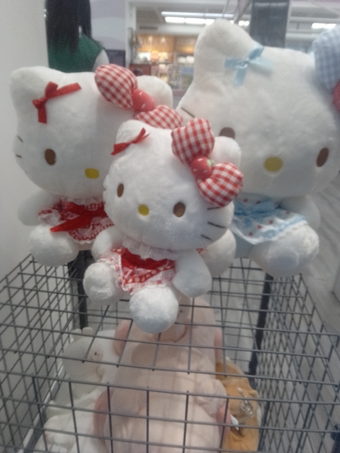 The scene depicts an interior view of a retail establishment in Unknown, Unknown. Three white Hello Kitty plush toys are prominently displayed within a metal wire shopping cart or display bin. The plush on the left wears a red ribbon bow on its left ear and a red-and-white patterned dress with white lace trim. The central plush features a red-and-white gingham bow with a red accent on its left ear and a similar red-and-white patterned dress with white lace trim. The plush positioned to the right-rear has a light blue ribbon bow on its left ear and a light blue-and-white patterned dress with white lace trim. Other indistinct plush toys, including light pink and brown items, are visible inside the lower section of the wire bin. The background shows a blurred view of store aisles with illuminated merchandise shelves. No human subjects are visible.