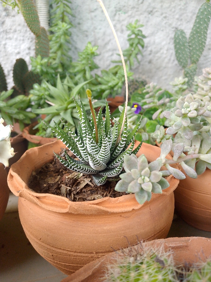 A collection of potted succulents sit closely together. The main focus is a small terracotta pot containing a Haworthia fasciata, recognizable by its zebra-like stripes. A tall, thin flower stalk emerges from the center. To the right is a pot of soft, pale succulents. Several other plants, including cacti and leafy greens, are visible in the background, suggesting a small garden. The terracotta pots have a rough, handmade appearance.