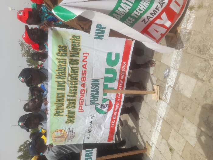 group of people holding a banner that reads "Petroleum and Natural Gas Senior Staff Association Of Nigeria (PENGASSAN)" in front of a building in Gusau, Nigeria