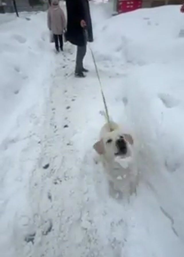 A person holds a handful of snow towards a light yellow Labrador retriever on a leash that stands on a snowy path. The dog snaps at the snow in the person’s hand. Two people walk ahead of the dog and person holding the snow. The environment is snowy and looks like a sidewalk near buildings. There is a light post and bushes to the left. There is a red object behind a large pile of snow to the right.
