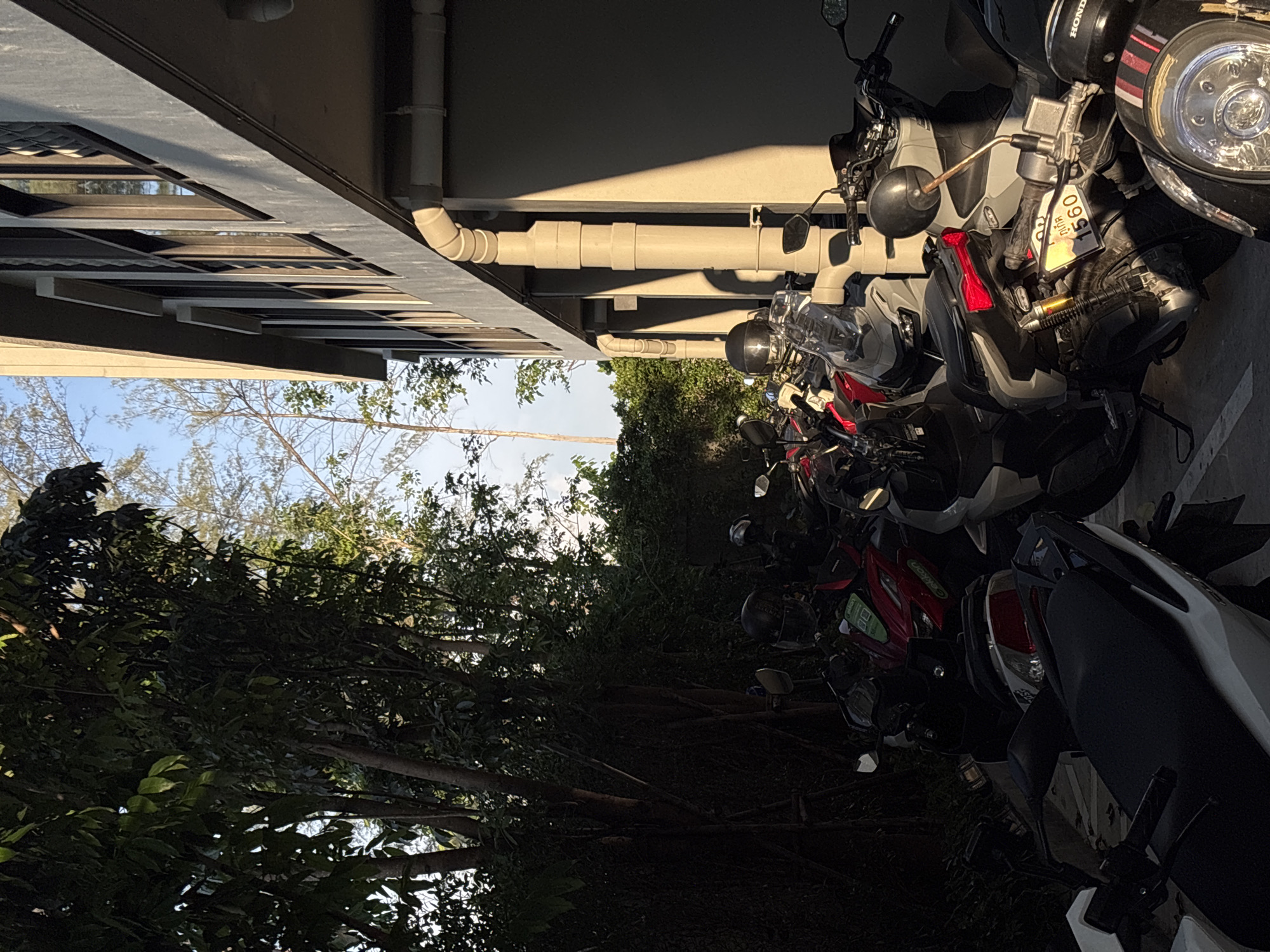 parking area for motorcycles located in Choeng Thale, Thailand. A row of various motorcycles are parked tightly together, adjacent to a building with exterior pipes. Trees and foliage are visible in the background, obscuring the sky. The scene appears to be taken during daylight hours.