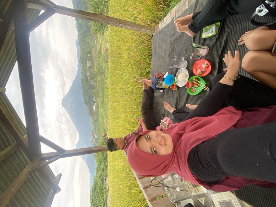 - "The scene depicts three individuals gathered under a rustic wooden gazebo in the city of Penanggungan, Indonesia, overlooking a landscape of vibrant green rice paddies and a prominent mountain peak under an overcast sky" by FM-htxI33, licensed under CC BY 4.0