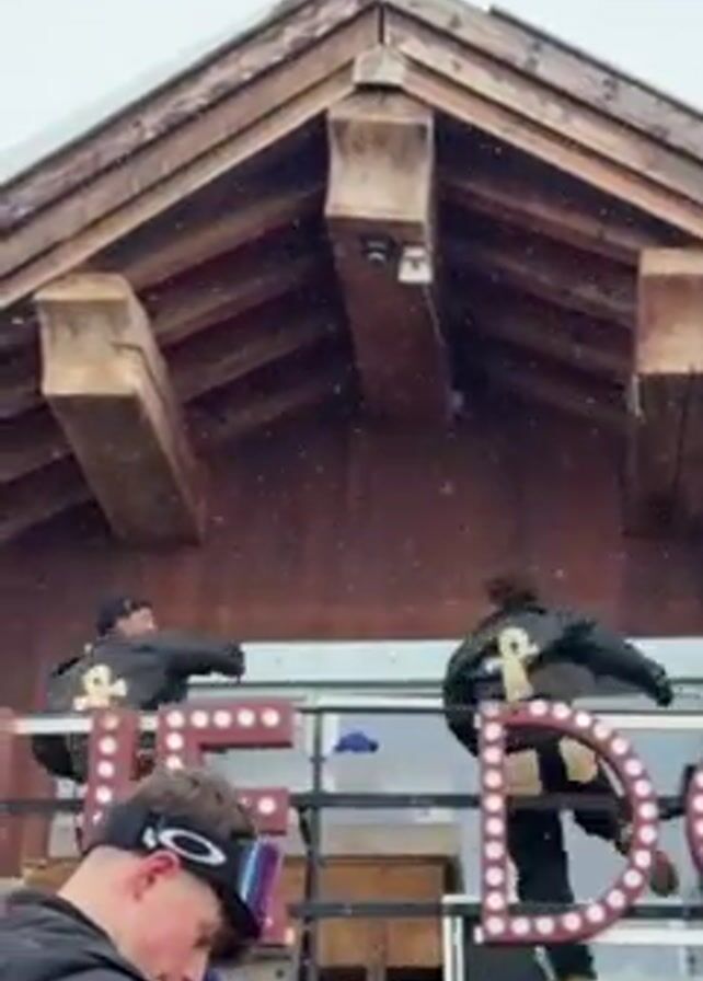 Two men dressed in black leather jackets and black pants are dancing on a balcony in the snow. Behind them is a building with a steep, dark wood roof and a sign with the word "EIDDOD" outlined in lights. The letters are large, each one nearly as tall as the men. Below, a person in a black jacket and ski goggles passes in the foreground. Snow falls steadily throughout the scene. The sky is overcast and grey. The focus is primarily on the men dancing.