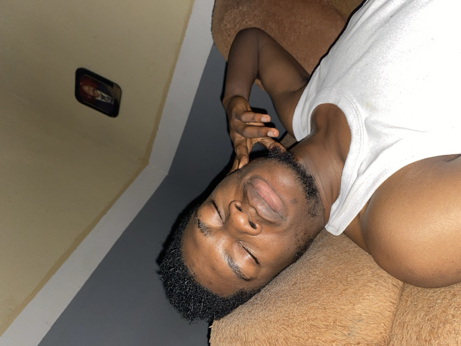 An adult male, appearing of African descent, is depicted resting or sleeping indoors