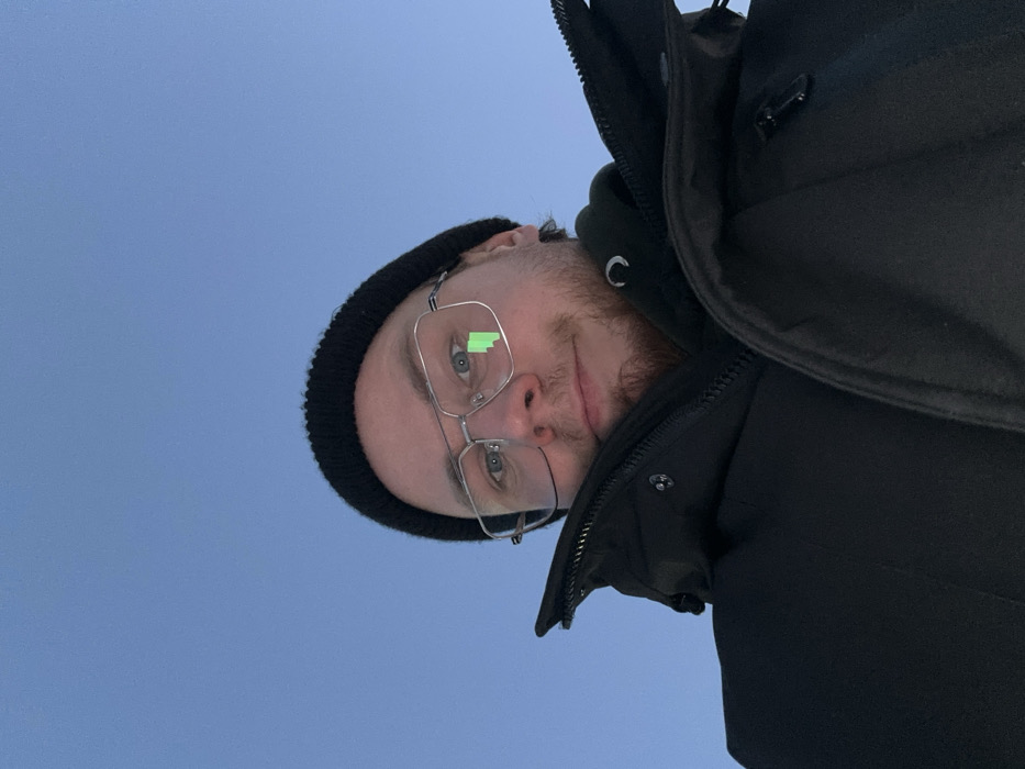 A selfie from a low angle shows a man wearing a black beanie and glasses. The glasses reflect a bright, green light. He has a light beard. He is wearing a black hooded jacket, zipped up. The background is a clear, light blue sky. The photo is slightly rotated, making the man appear slightly off-kilter.