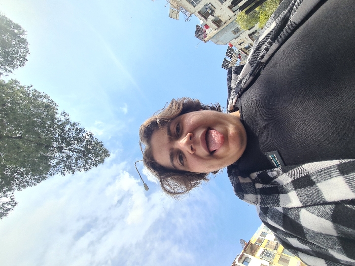 This low-angle image depicts an individual in Barza Municipality, Syria, captured against a bright blue sky with scattered white clouds. The subject, positioned centrally and occupying the lower frame, has medium-length curly brown hair and looks directly at the camera with their tongue extended. They are wearing a black long-sleeved shirt with a small rectangular tag on the left chest, covered by an open black and white plaid long-sleeved shirt. The urban background features multiple-story buildings. To the left, a light-colored residential building with visible balconies and a satellite dish on its roof is partially shown. A street light with a curved arm is visible extending from the upper left. To the right, another multi-story building, appearing older, displays several dark rectangular units (likely solar panels or water heaters) and laundry hanging on its rooftop. Dense green tree canopies are visible at the top of the frame and to the far right.