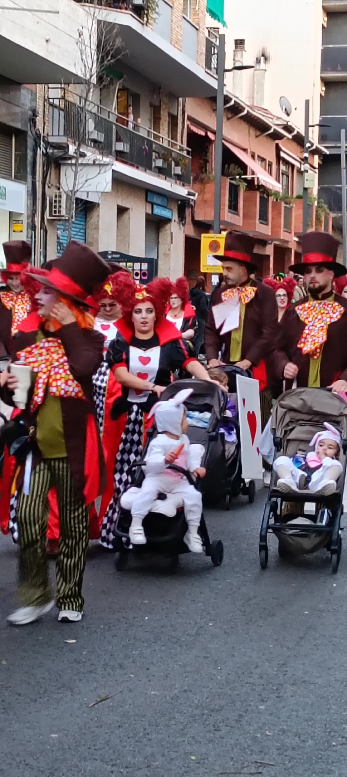 A group of people are parading down a city street in "Alice in Wonderland" themed costumes. Several people are dressed as the Mad Hatter and the Queen of Hearts, with two babies dressed as white rabbits in strollers. The adults wear colorful patterned bow ties and hats. Buildings line the street in the background.