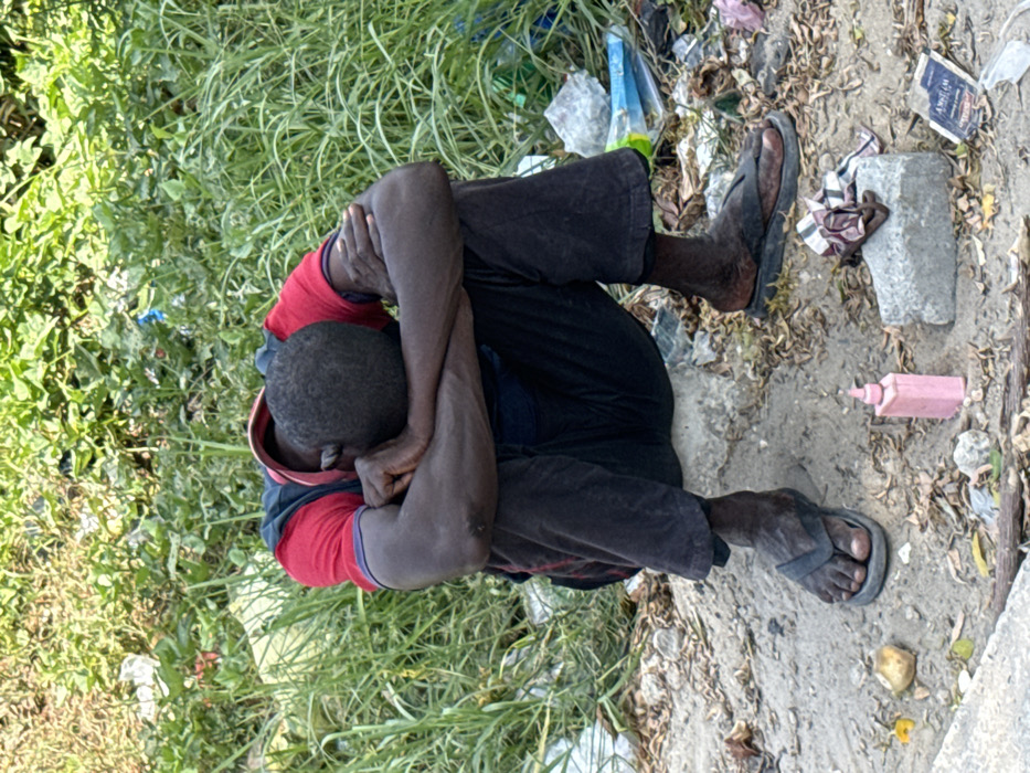An adult male with dark skin and short dark hair is seated outdoors in the city of Ojomu, Nigeria. He is wearing a red t-shirt, a dark undershirt or vest, dark pants, and black flip-flops. His head is bowed, resting on his crossed forearms which are supported by his bent knees. He sits on a light-colored concrete block on sandy ground. A small pink plastic bottle with a pointed cap is on the ground near his left foot. To his right, another rectangular grey concrete block features a striped cloth, and a white paper packet is visible nearby on the ground. The background consists of dense green vegetation, including tall grass and leafy plants, heavily intermingled with discarded plastic bottles, bags, and other refuse. The immediate ground also shows scattered dry leaves and debris. The scene is illuminated by natural daylight.