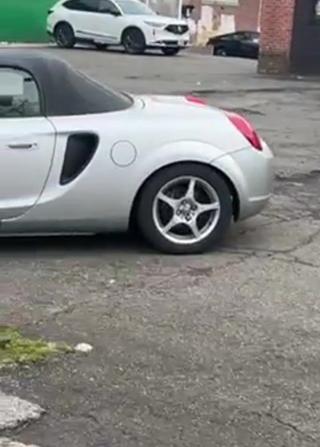 silver Toyota MR2 Spyder parked on a cracked asphalt surface. The car has a black convertible top. Other vehicles are visible in the background. The video starts with a close-up of the rear wheel and pans to show the entire side of the car, then moves to the front. A utility pole with graffiti is in the foreground, partially obstructing the view. Sounds of music can be heard in the background.