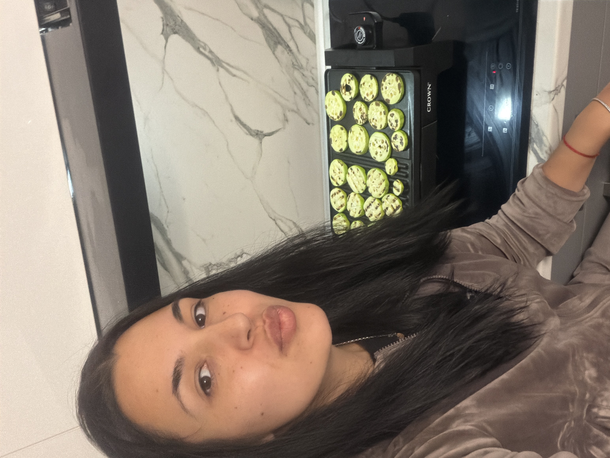 A single female, appearing to be a young adult with long dark hair, light brown complexion, and a puckered lip expression, is captured in a selfie within a modern kitchen in Sofia, Bulgaria. She is wearing a light brown velvet or velour zippered garment, a silver chain necklace with a small pendant, and bracelets on her right wrist (a thin red string and a silver-colored, stone-set band). An active black 'CROWN' electric grill, laden with numerous grilled zucchini slices exhibiting charring and distinct grill marks, is positioned on a white marble-patterned countertop to her right. A black induction cooktop with illuminated controls is visible adjacent to and partially beneath the grill. The kitchen features a white marble-patterned backsplash and white overhead cabinetry, with a black rectangular fixture visible above the backsplash.