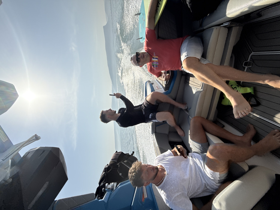 Three adult males are observed on a moving motorboat on a large body of water, identifiable as the Sea of Galilee near Migdal, Israel. The scene occurs on a sunny day with a clear blue sky, indicated by the high sun causing a lens flare at the top of the frame. The boat is a modern motorboat with blue and grey seating and decking, actively generating a wake. On the left, a male with curly light brown hair, wearing a white t-shirt and grey shorts, is seated and looking down at a smartphone in his hands. In the middle, a male with short light brown hair, dressed in a black long-sleeved athletic shirt and black patterned shorts, is seated and holding a black smartphone aloft, appearing to capture media of the distant landscape. On the right, an older male with short hair, wearing sunglasses, a red t-shirt, and light grey shorts, is seated with his legs crossed, holding a clear cup with a reddish liquid. All three individuals are barefoot. Two wakeboards or surfboards, one yellow-green and one light blue, are stored along the right side of the boat. A black bag or watersports equipment is visible near the blue hull on the left, and a neon green life vest is partially visible on the deck. Hazy landmasses or mountains are visible on the horizon across the water.