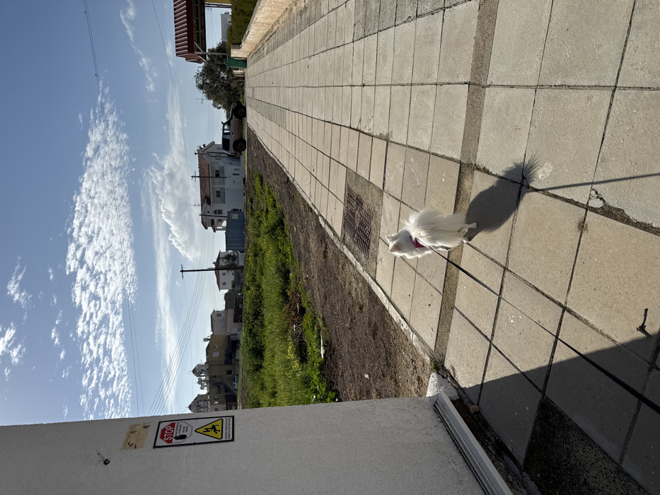 The image depicts an outdoor scene in Paralimni, Cyprus, under a clear blue sky with scattered white clouds. The primary subject is a small, fluffy white dog, wearing a red harness and attached to a black leash, walking away from the viewer on a paved sidewalk composed of light-colored square concrete tiles. The dog casts a distinct shadow to its left. In the immediate foreground on the left, a section of a white building wall is visible. Affixed to this wall are two signs: a red circular "STOP" sign with a white hand symbol and text, and a yellow triangular warning sign with a black border, a lightning bolt symbol, and Greek text indicating "HIGH VOLTAGE / DANGER OF ELECTRIC SHOCK." Adjacent to the sidewalk on the left is an unpaved area of dry earth with sparse green vegetation. A rectangular metal grate is embedded in the sidewalk surface. In the midground and background, various structures are visible. To the far left, a building with multiple domes, consistent with a church or religious structure, rises above other buildings. Several two-story residential-style buildings, predominantly white or light-colored, are scattered across the scene. Utility poles with overhead power lines traverse the landscape. Towards the right side of the background, a light-colored SUV is parked at the end of the paved path, which transitions into an access road. To the left of the SUV, a blue shipping container is visible behind a house. A covered structure with a reddish roof is also present on the far right. No human figures are visible in the scene.