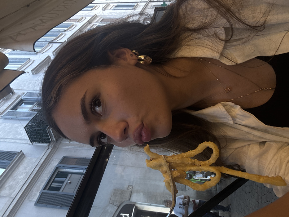 A young adult female is prominently featured in the foreground, facing slightly right but looking towards the viewer with a pursed-lip expression. She has long, dark brown hair and wears a light-colored, open collared shirt over a dark top. Her right ear is adorned with multiple gold-toned earrings, including large hoops and small studs. Two delicate gold-toned necklaces with distinct pendants are visible around her neck. She holds a silver fork elevated in front of her mouth, laden with a tangled mass of golden-brown, irregularly shaped fried food, consistent with fried pasta or fried zucchini flowers. The background depicts a street scene in Rome, Italy. Behind the woman, a partial restaurant awning with inverted text, likely "RISTORANTE," is visible. Beyond this, a multi-story building constructed of light-colored stone features numerous windows fitted with closed grey shutters and a small, ornate wrought-iron balcony. A faint number, possibly "35," is visible on the building's facade. In the deeper background on the left, a blurry male figure wearing a light shirt and a red bandana or scarf is standing on a sidewalk or street. The architecture and restaurant setting are characteristic of urban areas within Rome.