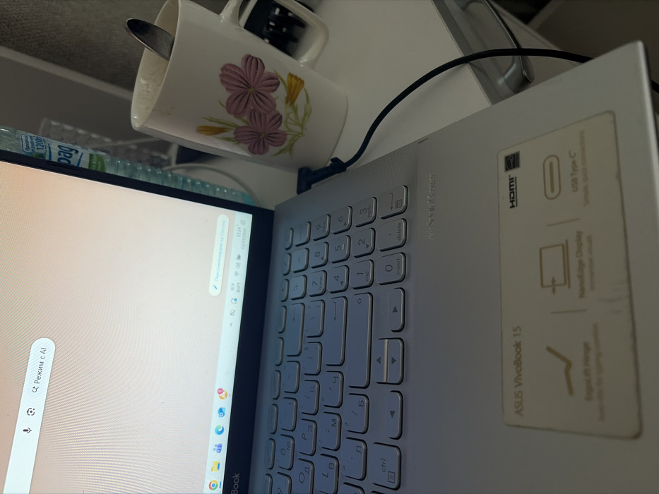 The scene depicts an indoor desk setup in Kableshkovo, Bulgaria. A light-silver ASUS Vivobook 15 laptop is open on a light-colored surface. The laptop screen displays a web browser, identified as Google Chrome by its icon and text "Режим с AI" (AI mode) in the search bar. The taskbar indicates system information including a Wi-Fi connection, battery status, and the date 12/03/2026 at 11:14. The laptop's keyboard features a QWERTY layout augmented with Cyrillic characters. A black cable is connected to the left side of the laptop. To the right, a white ceramic mug, decorated with pink and yellow flowers on green stems, contains a silver spoon and a light-colored liquid. A clear plastic water bottle with a blue label, partially visible behind the laptop screen and mug, sits on the same surface. The background is an out-of-focus light-colored wall or cabinet. No individuals are present in the image.