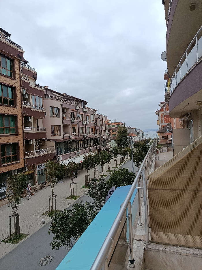 The image depicts an elevated view from a balcony overlooking a city street in Burgas, Bulgaria, under an overcast sky