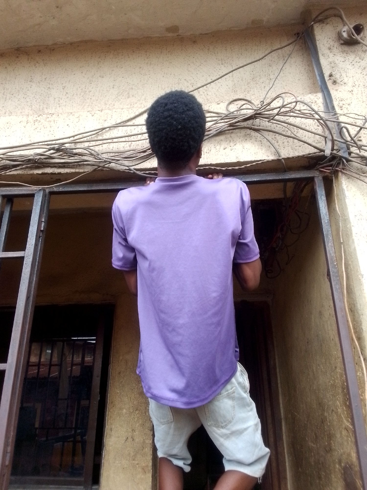 A person with dark curly hair is standing on a structure and holding onto the dark metal frame of a doorway or window. The person is wearing a short-sleeved purple shirt and light-colored shorts. The person is facing away from the camera. Above the doorway or window, there are numerous electrical wires running along the wall. The wall is textured and appears to be part of a building exterior. The location is Unknown, Unknown.