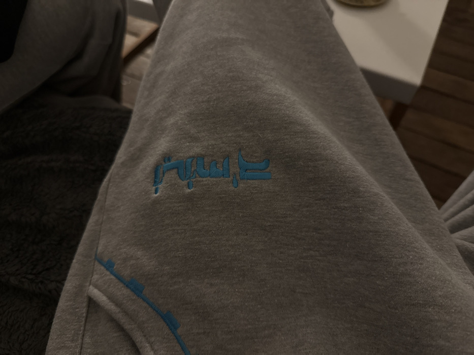 The scene captures a close-up of a grey heathered fabric garment, such as sweatpants or a hoodie, in an indoor setting within Paris, France. The fabric features light blue embroidered details: the Arabic script "الجزيرة" (Al Jazeera) positioned vertically on the mid-right, and a light blue geometric line pattern with small square segments along an upper-left seam, possibly indicating a pocket edge. The fabric exhibits a soft, slightly worn texture. In the out-of-focus background, a dark, fuzzy material occupies the upper portion, while a lighter surface and a dark brown, likely wooden, surface are visible in the lower right, along with a partially obscured light-colored circular object. No people, specific actions, or direct interactions are visible.