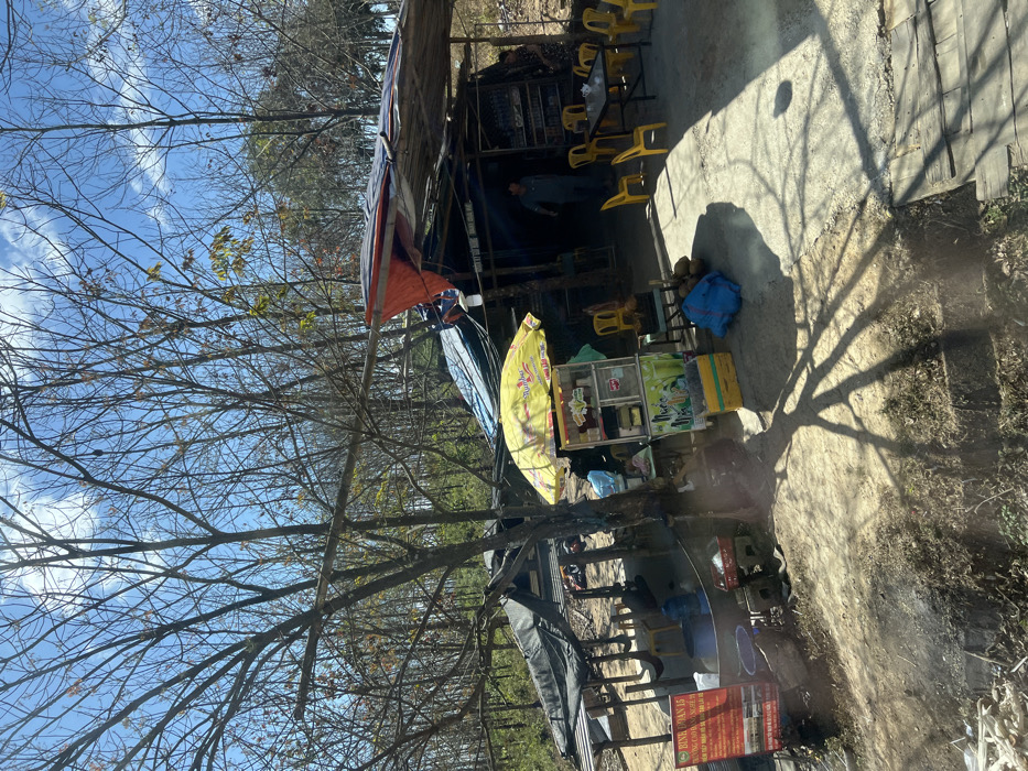 A roadside stall sits adjacent to a concrete area, partially shaded by bare trees. The stall, under a makeshift awning, displays a yellow umbrella and various goods. Yellow chairs surround a table nearby. A person stands within the structure. In the foreground, more stalls and tables with chairs line a pathway. A sign with Vietnamese script leans against one of the stalls. The sky is visible through the branches of the trees.