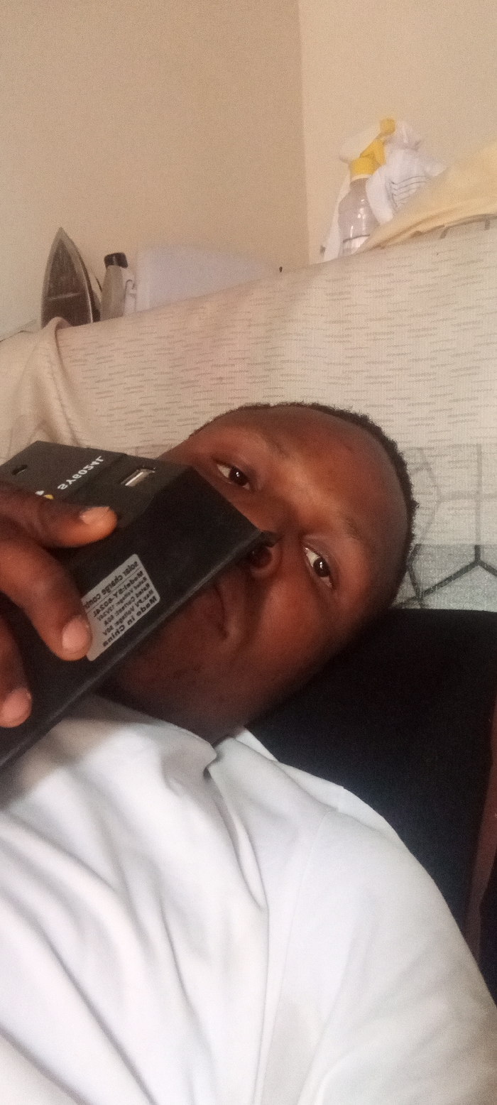 person of dark complexion partially obscured by a black electronic device. The subject is seen from the upper face, including eyes and forehead, and wears a white t-shirt. They are holding a black rectangular object identified as a solar charge controller, with visible text including "JASOAS.Y2-leb," "Solar Charge Control," "Model: Control," and "Made in China." A USB port is visible on the device. The individual is reclined against a light-colored patterned fabric, possibly upholstery. In the background, against a light-colored wall, an iron and a white bottle with a black cap are visible on the left side. On the right side, a clear plastic spray bottle with a yellow trigger and cap, draped with a white cloth, is also visible against a light-colored wall. The environment appears to be an indoor residential space. No visual information within the image confirms a specific location within Sabon Tasha, Nigeria.
