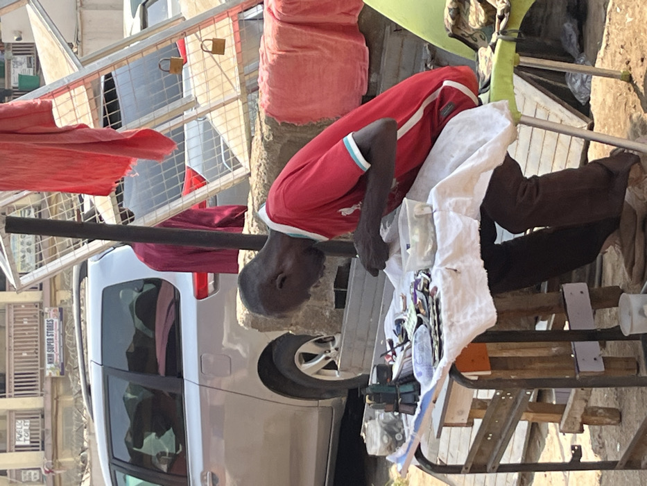 - "An adult male, dark-skinned and balding, is seated on a green plastic stool on dusty ground, leaning forward over a makeshift table covered with a white cloth" by FM-marMB2, licensed under CC BY 4.0