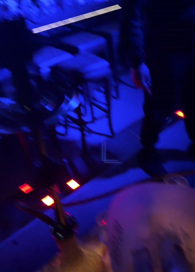 interior of a nightclub. A close-up shows a table with an ice bucket containing liquor bottles, glasses, and other items. The video then transitions to show the bar and the dance floor. People are dancing and standing around the bar. The lighting is blue and purple, and there are chandeliers hanging from the ceiling.