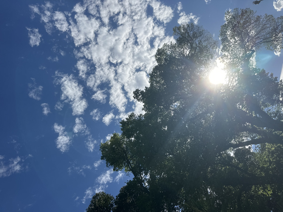 The image, captured from a low angle, displays a bright, partly cloudy sky above a dense tree canopy in Carlton, Australia