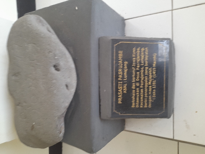 flat, gray, oblong stone, with a rough texture and several small indentations, resting on top of a dark gray rectangular pedestal. The stone is engraved with text, but it is illegible. Below the pedestal is a black plaque with gold lettering. The plaque states, “Prasasti Pasrujambe,” “Asal: Lumajang”, "Berbahasa dan berhuruf Jawa Kuno, Ditemukan di Desa Pasrujambe, Kecamatan Pasrujambe, Lumajang, Berisi penanggalan yang bertepatan dengan masa Majapahit, 1 Saka 1381 (1459 Masehi)". The scene is located in Kecamatan Buduran, Indonesia, at coordinates (-7.434, 112.72). The environment is tiled and white.