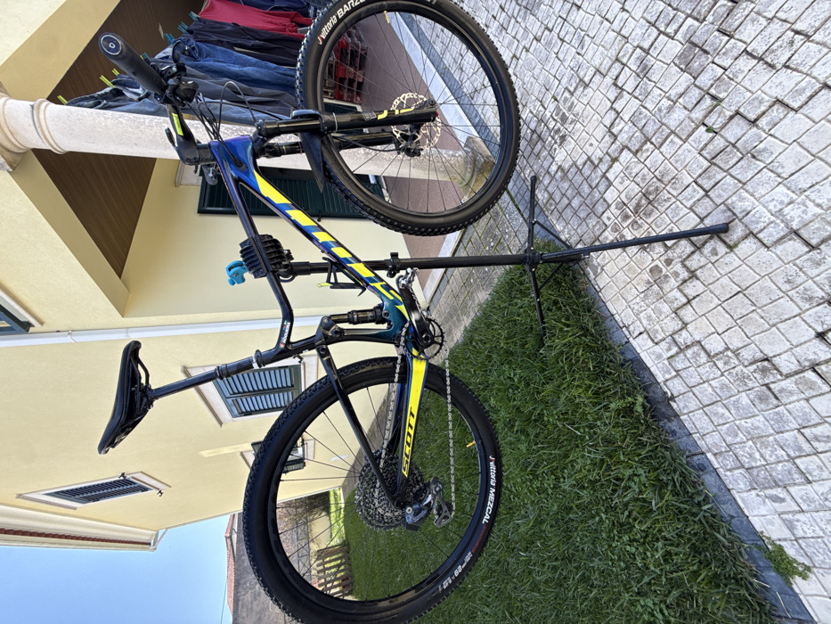 - "A Scott Spark RC full-suspension mountain bike, featuring a blue-to-black gradient frame with prominent yellow diagonal stripes, is mounted on a black tripod-style repair stand" by FM-k1rMm1, licensed under CC BY 4.0