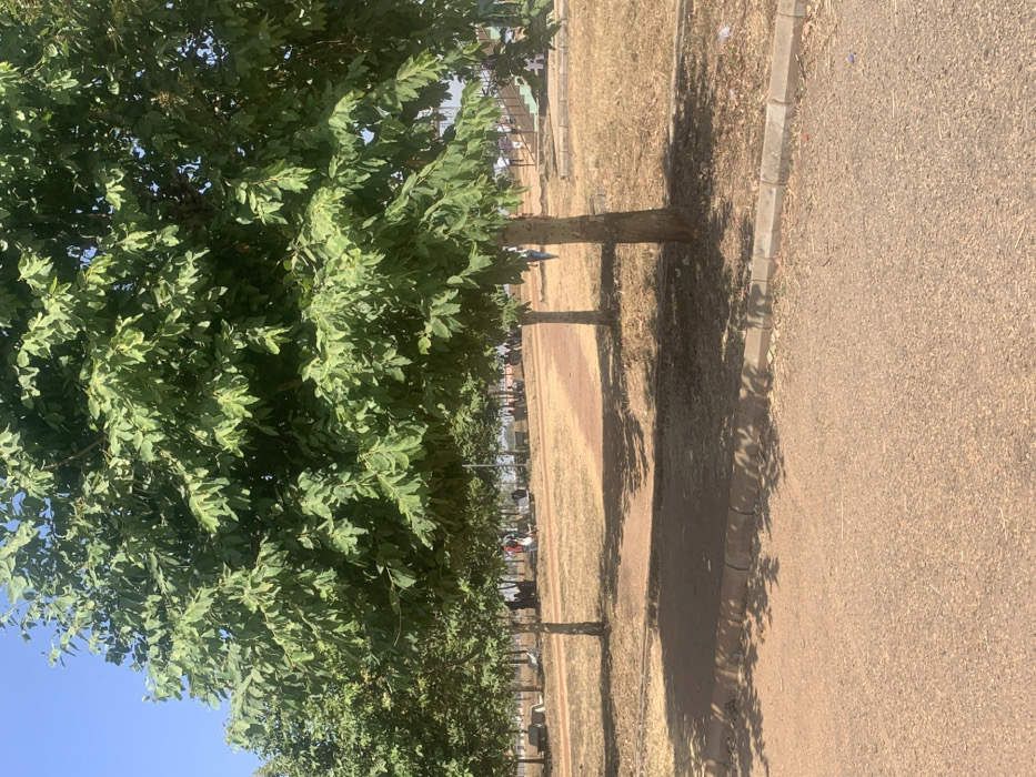 A row of trees lines a walkway and field. The trees on the left have dense green leaves, partially obscuring the view. The field appears dry and brown, bordered by the walkway on the right. The walkway surface is textured. Shadows from the trees stretch across the field and onto the walkway. A concrete curb runs alongside the walkway. People can be seen further down in the field. A clear blue sky is visible in the upper left corner.