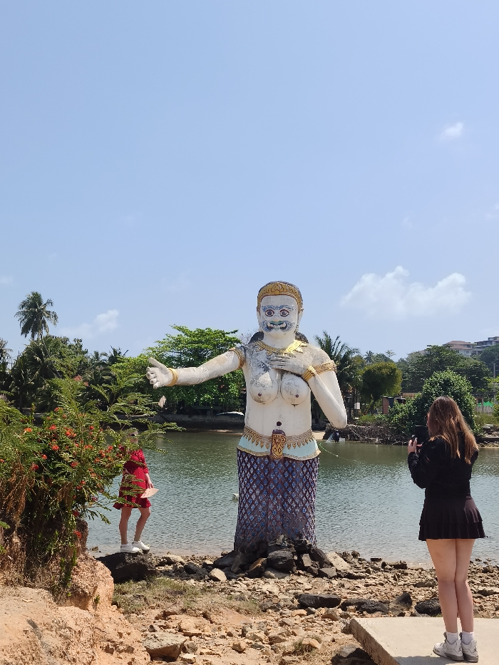 A statue of a figure with an ornate headpiece, white skin, and a decorative skirt stands in front of a body of water. A woman in a black skirt and jacket is taking a photograph of the statue. To the statue's left, near a bush with red flowers, stands a person in a red dress. The scene is set under a bright, clear sky, with trees and greenery in the background.