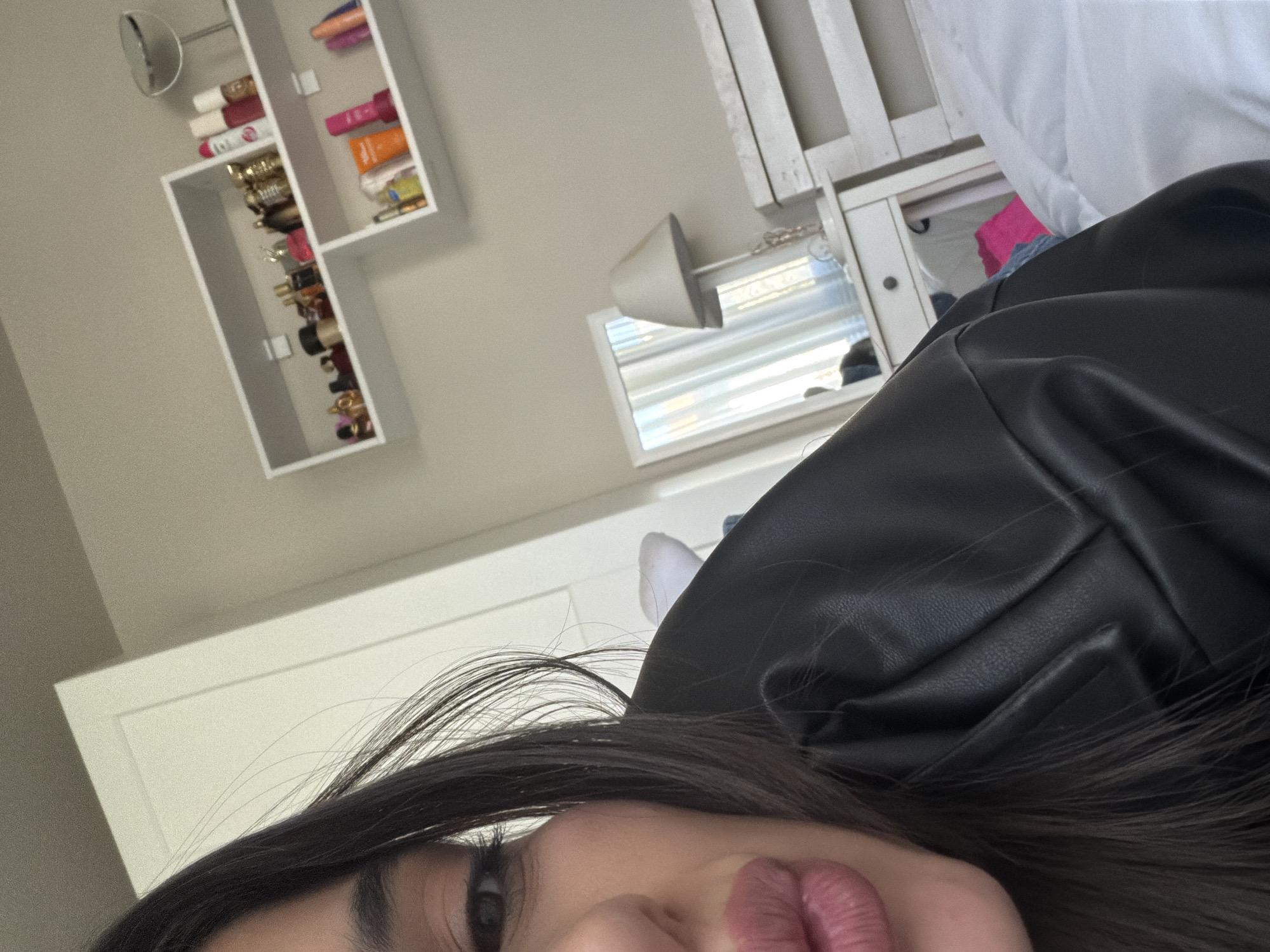 low-angle, close-up view of a person, primarily focusing on their face. Part of their right eye, nose, and mouth are visible. They have dark hair. A black, possibly leather, garment is draped in the foreground, obscuring part of the background. In the blurred background, there are white furnishings, including what appears to be a cabinet or shelf unit attached to a wall. The shelves contain various objects, including what appears to be makeup and accessories. Also visible is a small mirror and a lamp. Based on the prompt, the location is Dragichevo, Bulgaria, but there is no information from the image to confirm this. The scene appears to be indoors, likely a bedroom or similar personal space. There are no evident actions or interactions occurring in the frame.