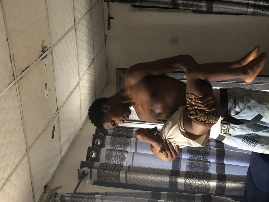 A shirtless man in a room with light blue jeans featuring a Versace belt, a tan t-shirt, and a leopard-print head covering is pictured. He appears to be standing near a window covered with patterned curtains. The room has white tiled walls and ceiling, with visible wear and tear. A small light fixture is visible in the ceiling.