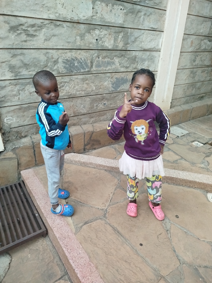 Two young children stand outside. The child on the left wears a blue and black jacket, gray pants, and blue Crocs. He holds his fingers together. The child on the right wears a purple sweater with a graphic, a white skirt, patterned leggings, and pink Crocs. She holds up a finger. They stand on tan stone pavers in front of a stone wall with a white trim piece to the right. A metal grate is to the left.