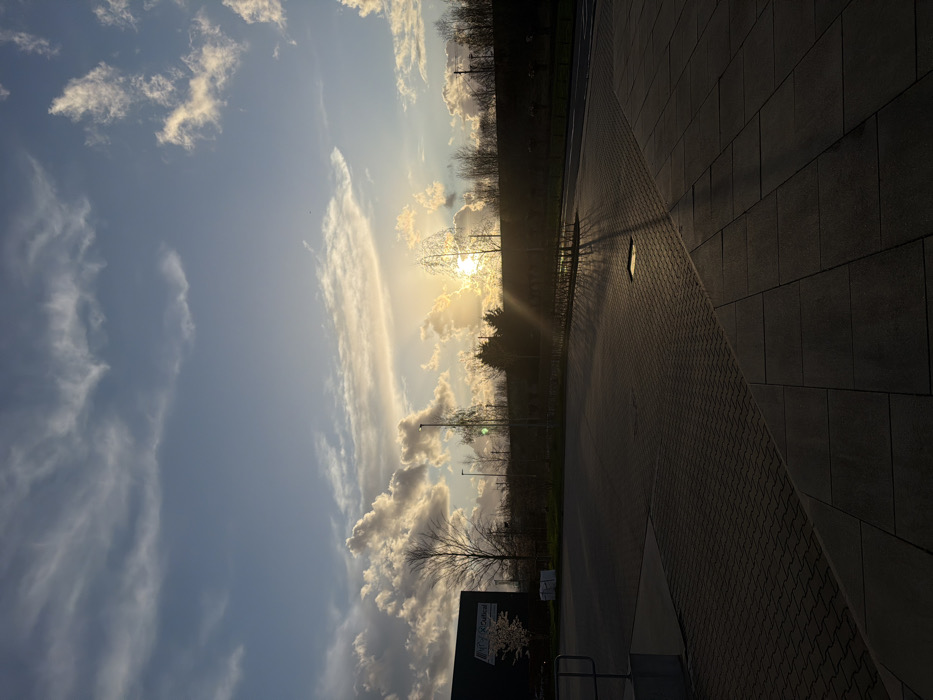 The image displays an outdoor scene at dusk, depicting a paved commercial or industrial area in Bleiswijk, Netherlands. The sun is low on the horizon, positioned slightly right of center, casting long, defined shadows across the ground toward the viewer. The sky transitions from a light blue at the zenith to warmer tones of orange, yellow, and grey near the horizon, indicative of a sunset. Scattered cumulus and cirrus clouds are present, with some directly illuminated by the low sun. In the left foreground, a grey concrete step with a metal handrail is partially visible. The ground immediately in front consists of dark grey rectangular paving slabs on the right, forming a diagonal boundary with smaller, dark interlocking pavers on the left. The midground is dominated by a large, unoccupied paved area, likely a parking lot or access road. A square utility access cover is embedded within this paving. To the left, a dark-colored building is partially visible, featuring a large white sign with dark text, which includes the word "INGECULTURE" or "CULTURES" and an associated graphic. Several bare deciduous trees stand in front of this building. Centrally and extending to the right in the midground, a line of leafless trees and utility poles cast prominent, elongated shadows across the paved surface. The sun's direct glare is intense, partially obscured by tree branches and clouds. The background presents a dense, dark line of bare trees silhouetted against the lighter sky, suggesting a tree line or wooded area, possibly situated on an elevated embankment. No individuals, vehicles, or animals are present in the depicted scene.