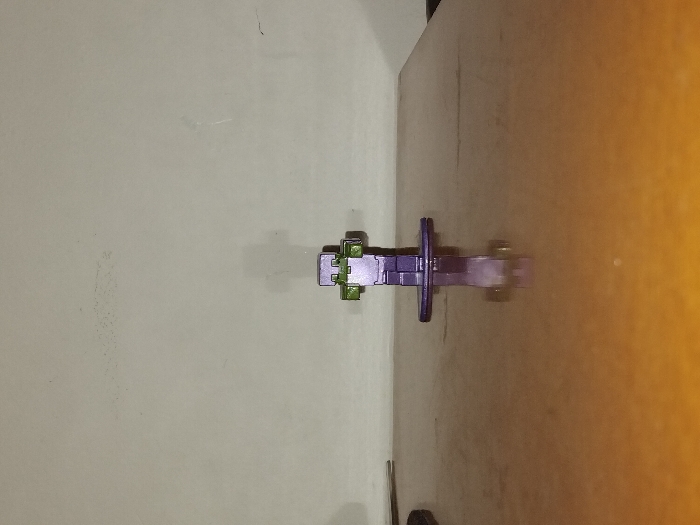 An indoor scene in Kazanlak, Bulgaria, depicts a small, stylized, blocky purple and green plastic figure standing centrally on a reflective, light brown wooden surface. The figure, approximately 10-15 cm tall, possesses a predominantly metallic purple body with green elements on its upper portion, resembling a simplified pixelated creature. It stands on a round, flat purple base, which casts a clear reflection on the glossy wooden surface below. The background consists of a plain, light grey wall exhibiting minor smudges and textural imperfections. A distinct, vertically elongated shadow of the figure is visible on the wall directly behind it, indicating front-on illumination. No individuals are present in the frame, and no discernible actions or interactions are occurring. The environment suggests a static, staged arrangement on a flat surface, possibly a table or desk.
