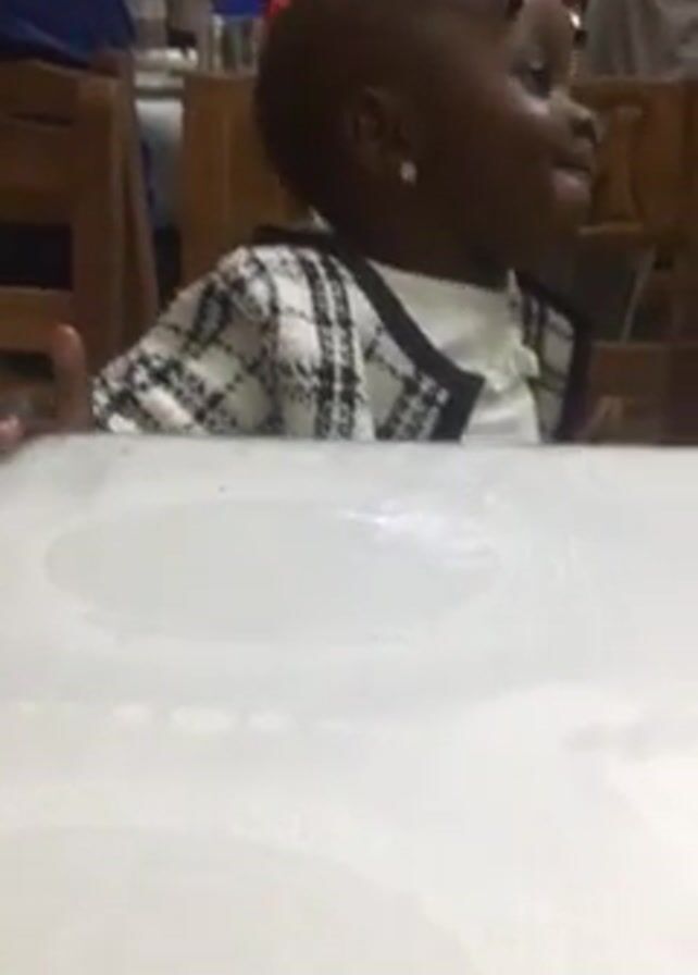 A young child with dark skin sits at a table in a room with other people. The child wears a white and black checkered jacket over a white shirt and has two small hair clips in their hair. The table has a white tablecloth. Other people are seated at nearby tables, and some are standing and moving around in the background. The room appears to be a dining area, possibly in a restaurant or event space.