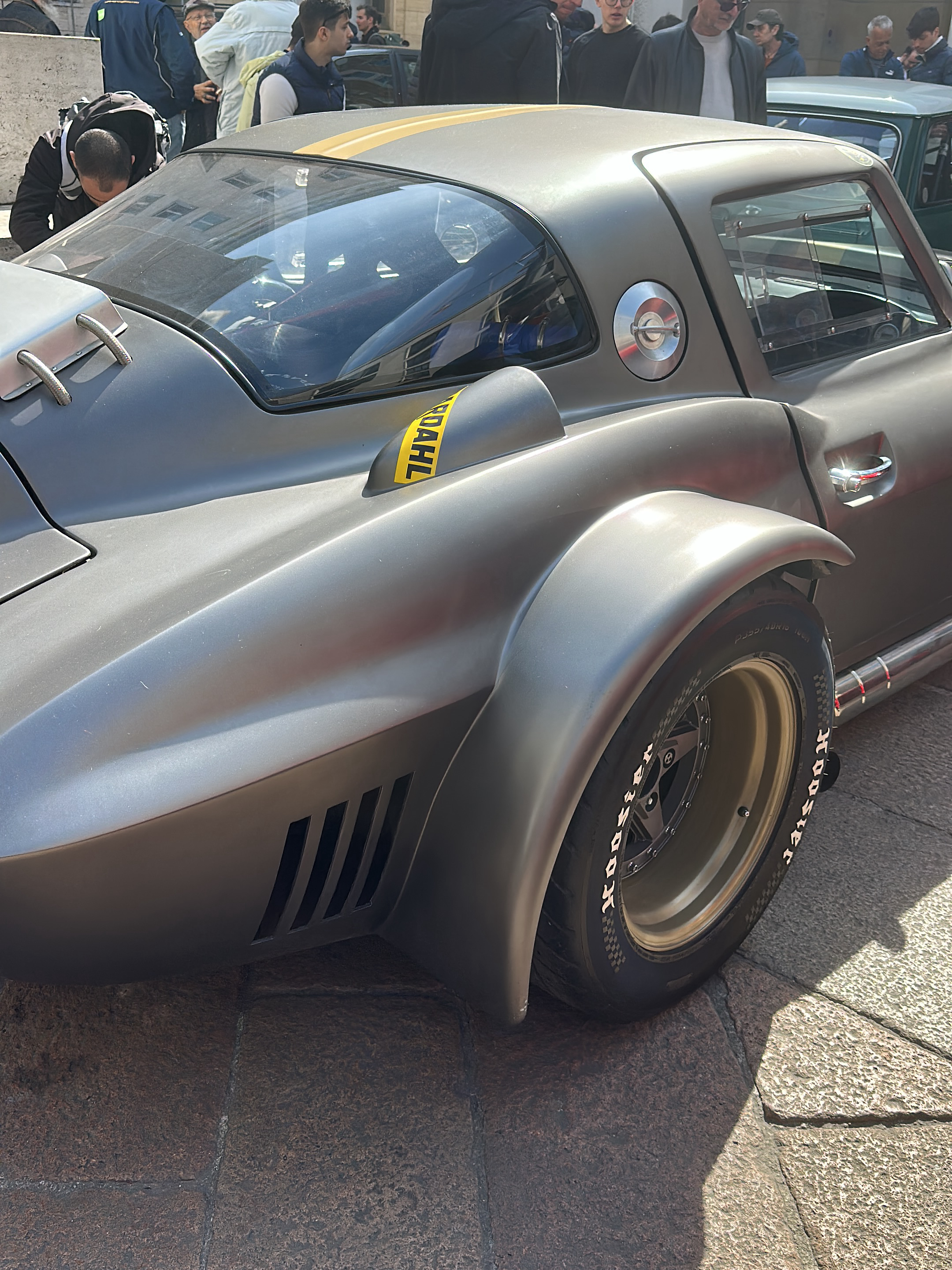 custom grey Corvette with a yellow racing stripe, taken in what appears to be a public square in Milano, Italy