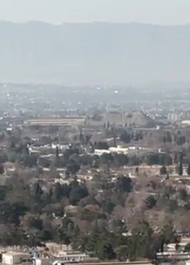 panoramic view of a city, likely from a hilltop or elevated vantage point. The city has a mix of buildings and green spaces, with trees scattered throughout. In the distance, mountains are visible on the horizon. The weather appears hazy, but the sky is bright blue in the wide shot. The immediate foreground consists of dry, rocky terrain with sparse vegetation. There are no people visible in the video.