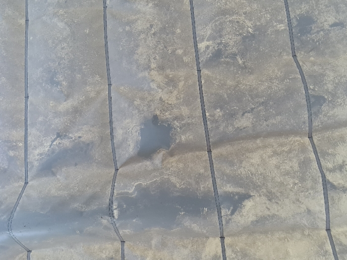 An aerial image depicts a large, textured surface within Barza Municipality, Syria. The scene is dominated by a mottled grayish-brown and light tan expanse, exhibiting unevenness and subtle undulations, consistent with disturbed earth or a worn, dirty fabric material. Six distinct, parallel, dark, undulating lines traverse the surface horizontally from left to right, appearing as creases, seams, or shallow depressions. These lines are punctuated at irregular intervals by short, perpendicular dark segments. No individuals, specific identifiable man-made objects beyond the linear features, or discernible activities are present. The environment appears open.