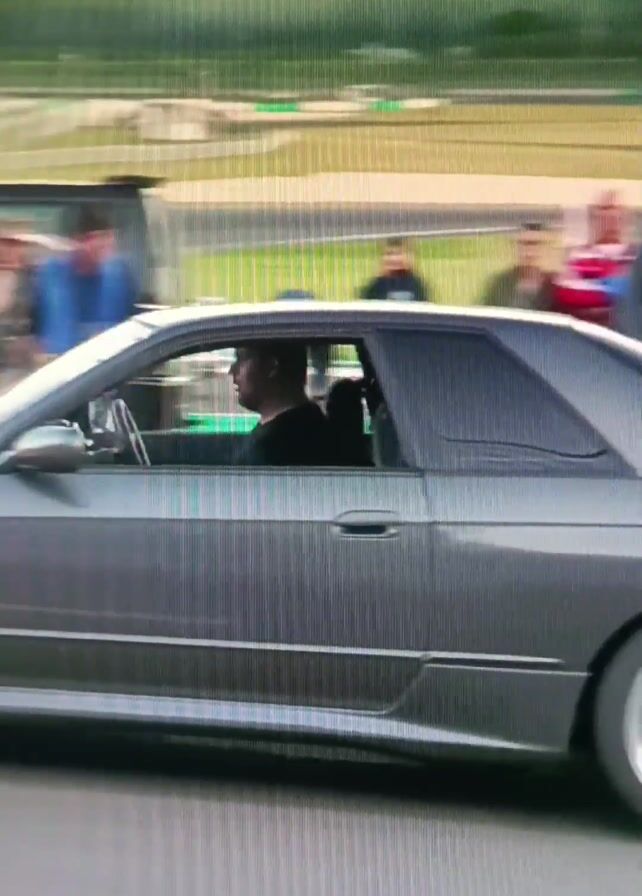 A gray Nissan Skyline drives slowly along a race track. A man wearing a green t-shirt, jean shorts, a black hat, and black and purple shoes walks behind the car. The car is being driven down a lane with white lines. Other people are standing behind a white structure in the background. An orange traffic cone stands beside the lane on the left.