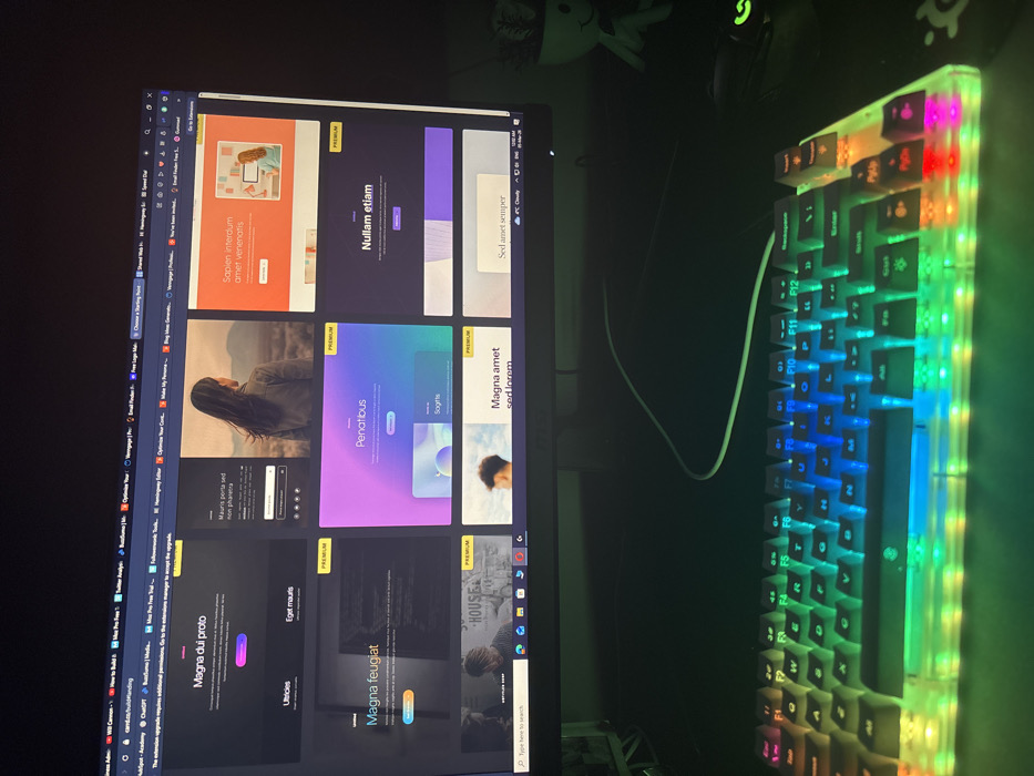 The scene depicts a computer workstation within a dimly lit indoor environment, located in the city of Peshtera, Bulgaria. The central object is a desktop monitor displaying a web browser interface. Numerous tabs are open across the top of the browser, with visible titles including "ChatGPT," "Email Finder for H...", "Veriage," and "Camtasia | build/landing." The main screen content is a grid of website design templates, several marked "PREMIUM." Visible template titles include "Magna dui proto," "Penatibus," and "Nullam etiam." One template displays a person viewed from behind, looking at a landscape; another depicts a person seated at a desk. The bottom right corner of the monitor's display shows "12:00 AM," "4°C," and "25-Mar." Directly in front of the monitor is a mechanical keyboard featuring a translucent case and active RGB backlighting, which projects a spectrum of colors across its keys. A white USB cable extends from the keyboard. To the right of the keyboard, a portion of a black computer mouse with green illuminated accents is visible on a dark mousepad that displays a white logo. A small, white, cartoon-character-shaped planter containing a green plant is situated on the desk surface to the far right. No individuals are present in the image. The environment suggests an indoor setting with minimal ambient light, primarily illuminated by the electronic devices.
