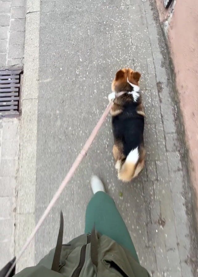 person walking a Corgi dog on a leash down a sidewalk. The person is wearing green leggings, a green jacket, and white shoes. The dog is walking next to the person on a pink leash. The sidewalk is gray and has a sewer grate on one side. The camera is positioned behind the person, looking down at the dog. The footage is shaky and taken from a first-person perspective.
