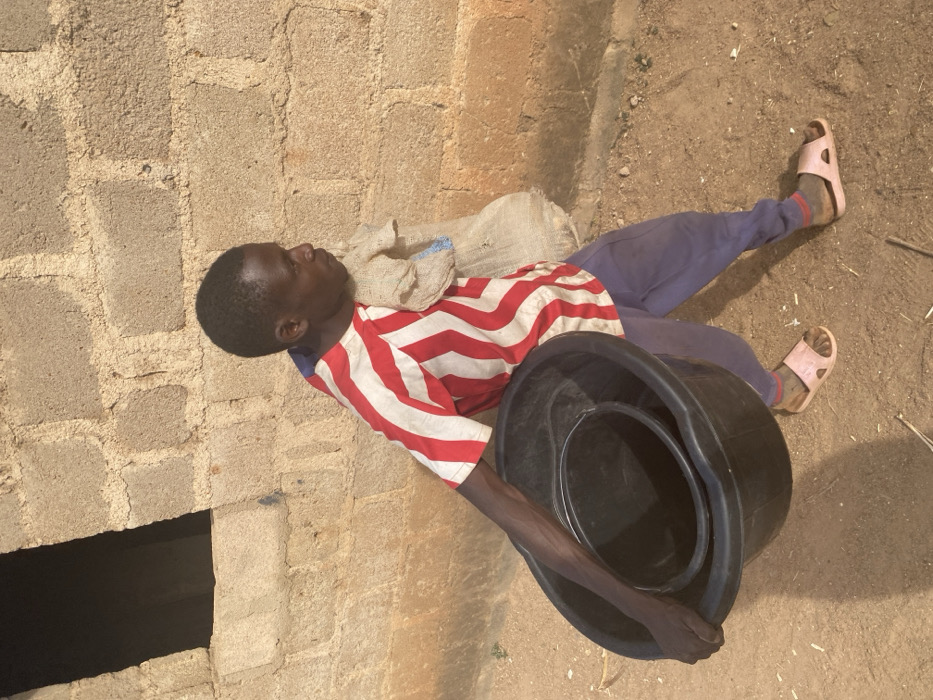 An individual, identified as a young male, walks from left to right across dry, reddish-brown soil in Udu, Nigeria. He wears a short-sleeved t-shirt with alternating red and white horizontal stripes, dark blue trousers, and light pink open-toed sandals. With his left arm, he carries two nested black plastic basins: a larger, oval-shaped basin containing a smaller, round bucket. A light-colored, coarse woven sack, appearing to hold contents, is slung over his right shoulder and rests on his back. The background consists of a wall constructed from light-toned concrete blocks, featuring a dark, rectangular opening in the upper left section. The scene is illuminated by bright, direct sunlight.