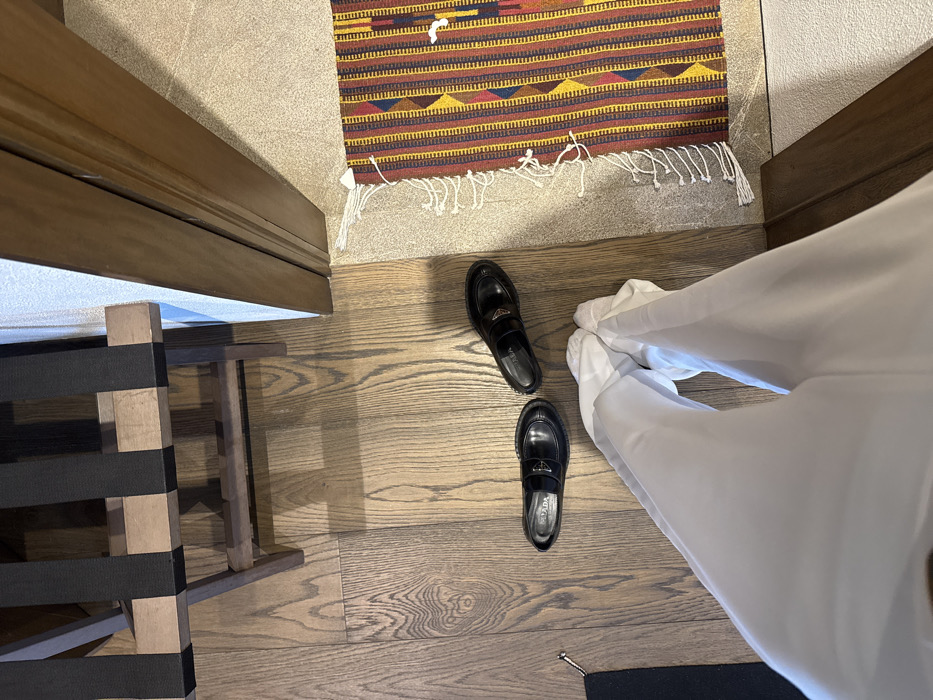 This image depicts an indoor floor scene from a high-angle perspective. The floor transitions from light brown wooden planks on the left to a light beige tiled or concrete surface on the right. In the upper left quadrant, a portion of a wooden luggage rack with black fabric straps is visible. Centered on the wooden floor are two black leather Prada brand loafers, each adorned with a silver-colored triangular logo. In the foreground, the lower legs and feet of one individual are visible, clad in white socks and loose-fitting white trousers or a similar garment, positioned above and slightly behind the loafers. On the tiled surface to the right, a rectangular rug featuring vertical stripes in colors including red, yellow, dark blue, and black, with white fringed edges, is displayed. The setting is consistent with a hotel room or private residence in Oaxaca City, Mexico, indicated by the typical style of accommodations and local textile patterns.