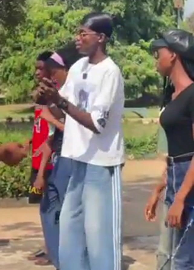 The video depicts a group of five individuals outdoors, likely in a park or recreational area. Four of them stand in a line, looking towards their left while moving their hands in what appears to be a coordinated action. The individuals are dressed in casual clothing: a red basketball jersey, a light green top and jeans, a white oversized t-shirt and jeans, and a black top with jeans and a cap. A fifth person, wearing a white t-shirt, a cap, and headphones, walks past them in the same direction. The environment consists of greenery, trees, and a paved area, giving the impression of a public outdoor space.