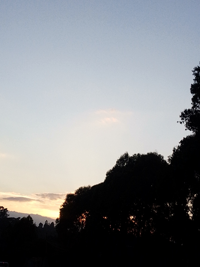 The image displays a landscape at either sunrise or sunset within Nachu ward, Kenya. The upper two-thirds of the frame consists of a sky transitioning from a light blue at the zenith to pale yellow and orange hues at the horizon. Several wispy, horizontally aligned clouds are visible in the lower-left quadrant of the sky, with a single faint, elongated cloud situated centrally in the upper portion. The lower third of the image is dominated by the stark silhouette of dense tree foliage, forming an irregular, dark mass against the brighter sky. Intermittent bursts of bright orange light are visible through gaps in the silhouetted canopy, indicating the sun's position behind the tree line. No individuals, man-made structures, or discernible actions are present. The environment appears natural and unpopulated.