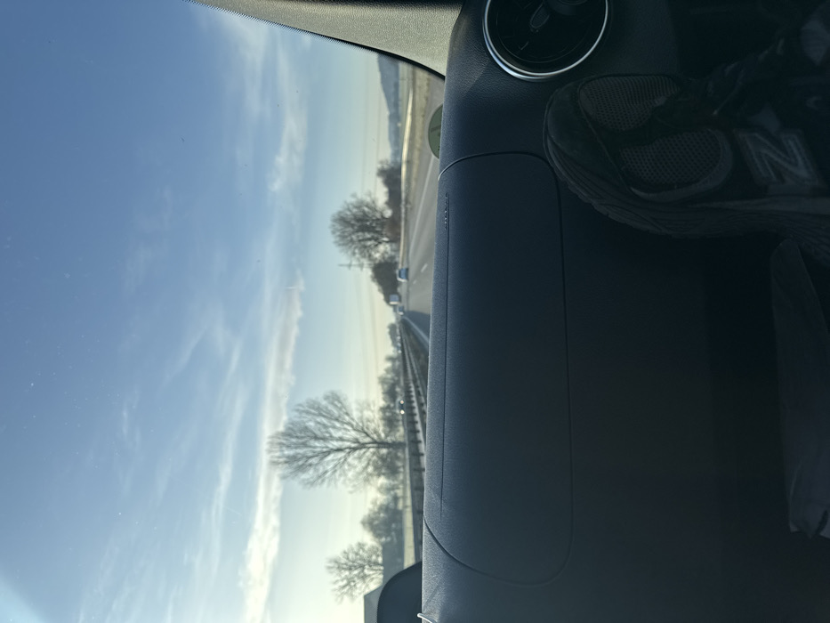 The scene depicts a view from the interior of a moving vehicle, specifically from the passenger's perspective, looking forward onto a multi-lane highway in the vicinity of Woringen, Germany. The lower half of the image is dominated by a dark, textured dashboard. On the right side of the dashboard, a circular air vent is visible. A right foot, clad in a dark grey athletic shoe with a visible "New Balance" (N) logo, rests horizontally on the dashboard, with the sole facing upwards. Faint text, likely "AIRBAG," is discernible on the dashboard to the left of the air vent. Through the vehicle's windshield, a highway extends into the distance under a clear, bright blue sky with scattered cirrus clouds. The highway features multiple lanes of travel, with visible white lane markings. Several vehicles are observed traveling in the same direction in the middle and far distance. A metal guardrail parallels the right side of the highway. The roadside landscape consists of numerous bare deciduous trees, indicative of a winter or early spring season, bordering fields that recede into a slight atmospheric haze. Utility poles or similar structures are faintly visible on the right side of the horizon, where distant hills or elevated terrain are also discernible. The lighting suggests daytime conditions.