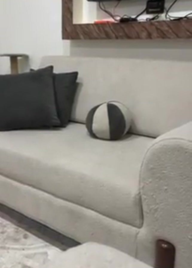 close-up of a living room setting. A light beige couch is the main focus, adorned with two dark grey square pillows and a round pillow with alternating grey and beige sections. A television mounted on the wall with a brown wooden frame is visible in the background along with power cords and a cable box. Part of a patterned rug is visible in the lower left corner.
